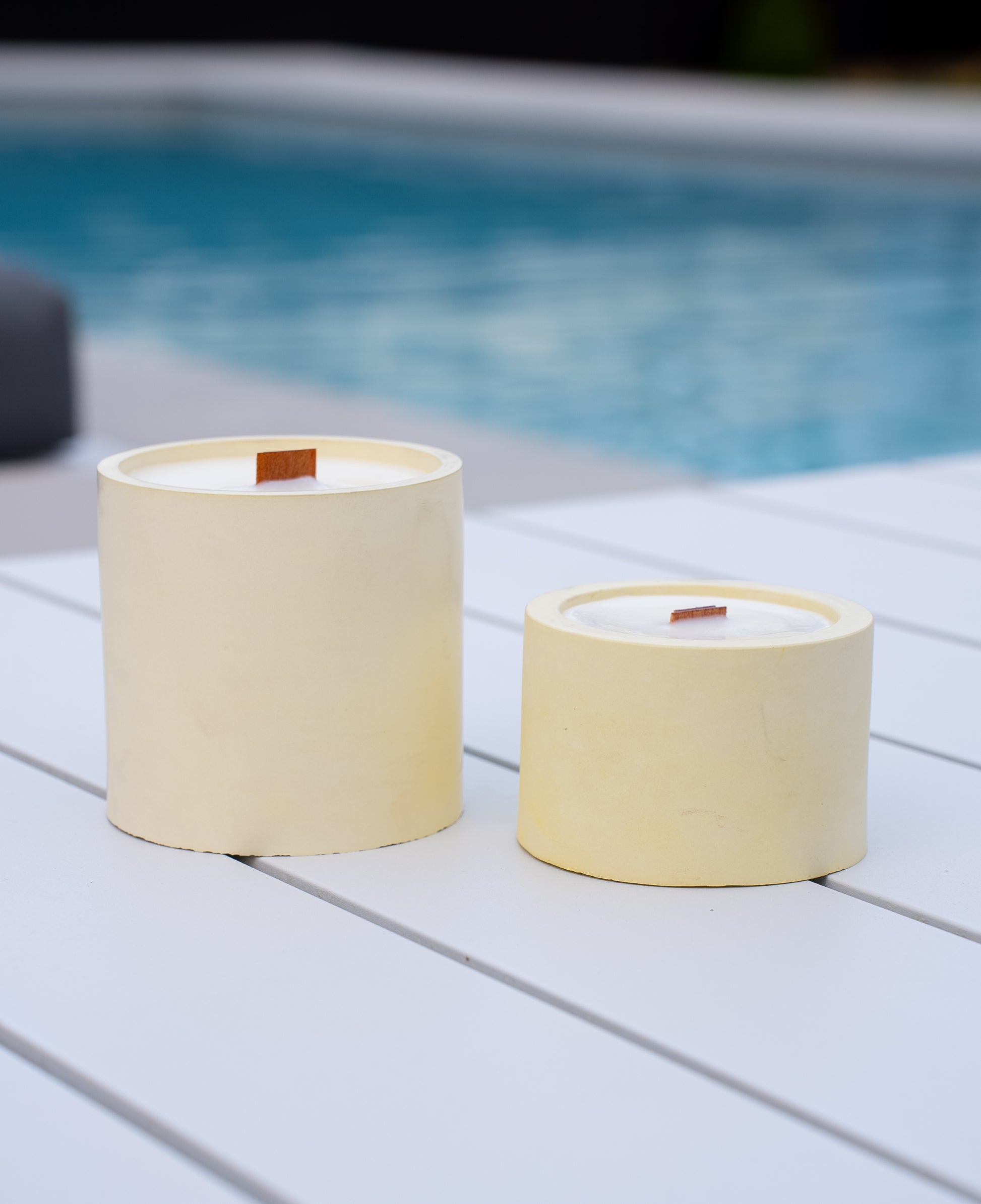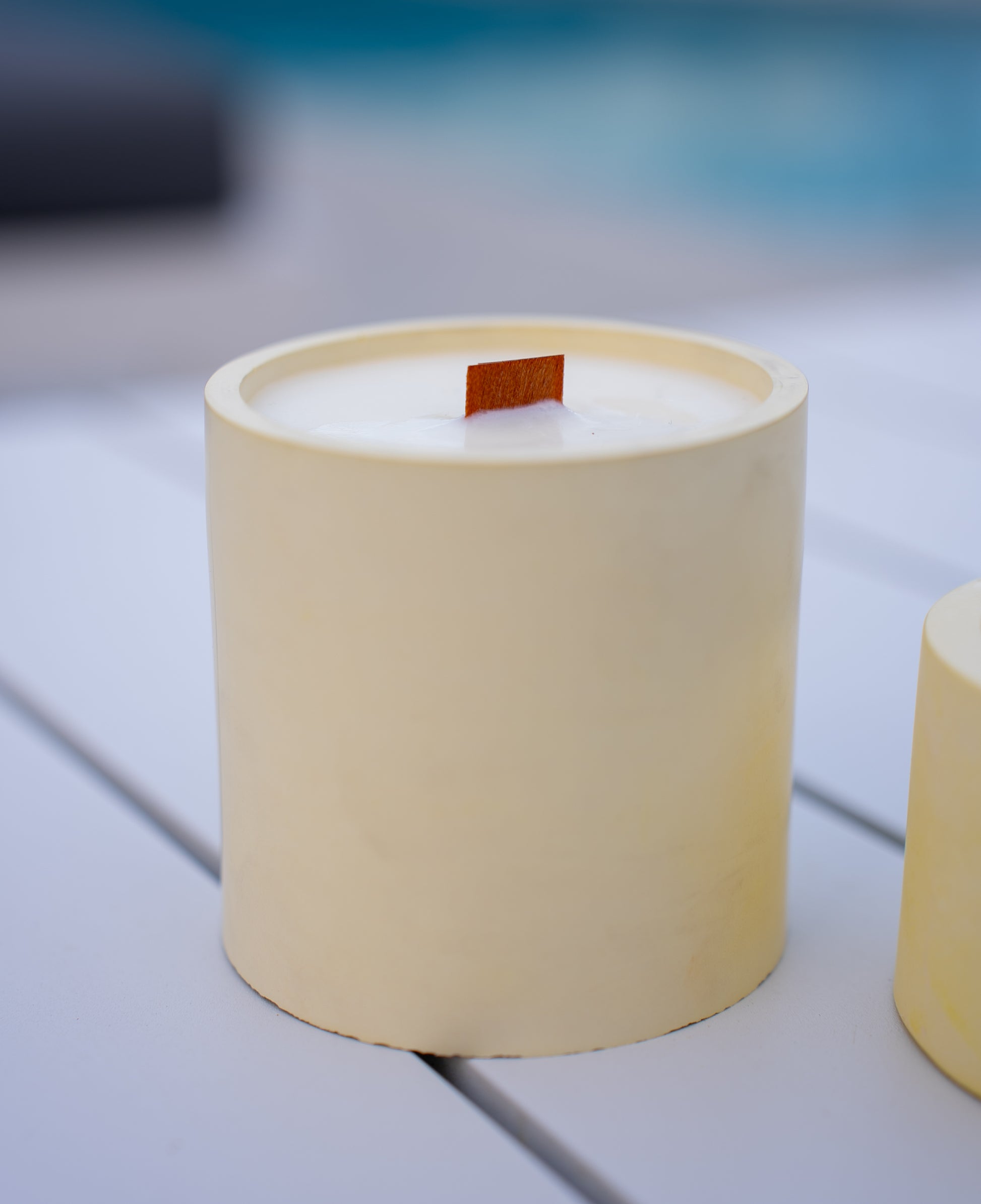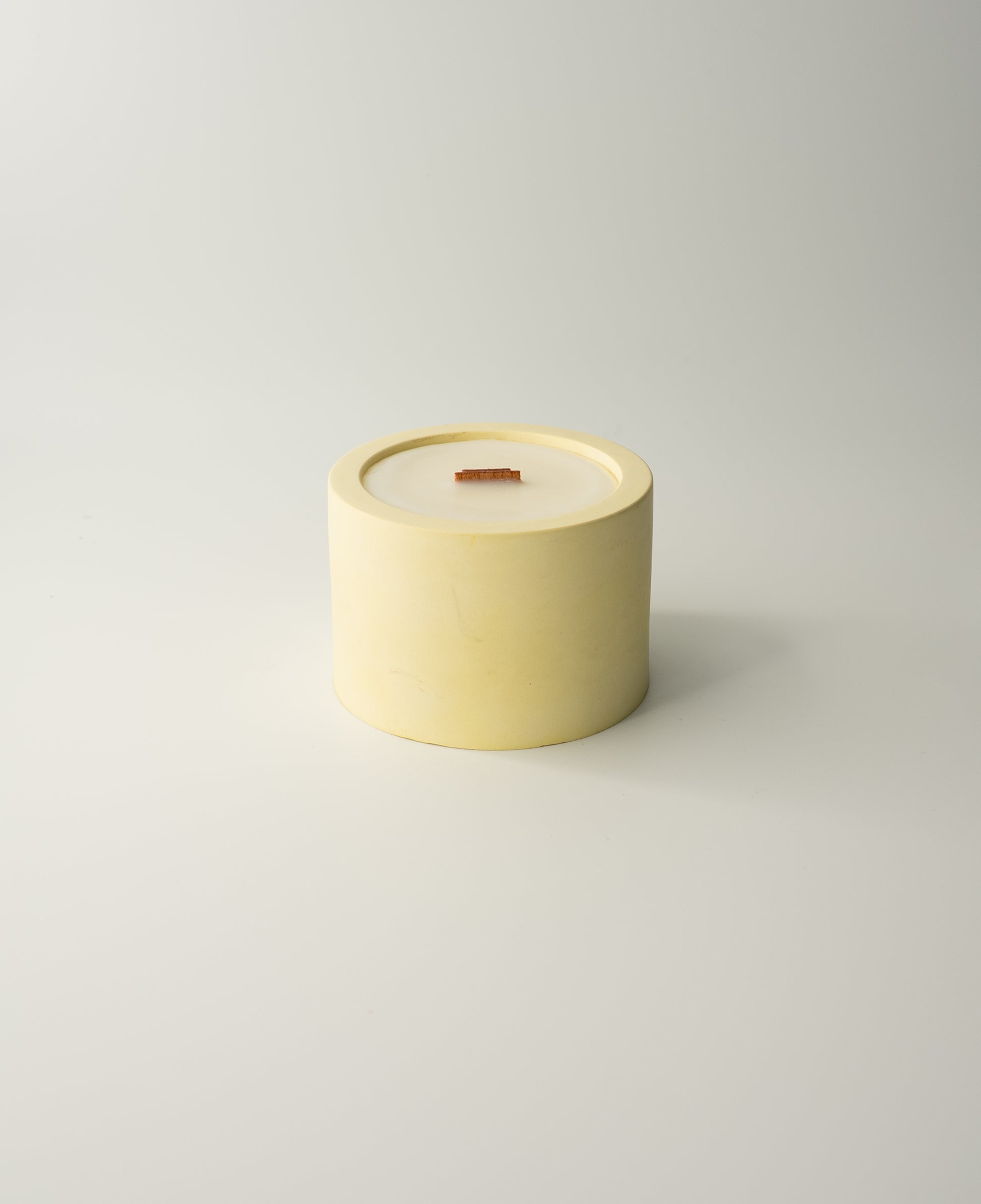 Coulée à la main dans un pot jaune en jesmonite fait main, chaque bougie est une création unique, apportant une touche lumineuse et chaleureuse à votre décoration.