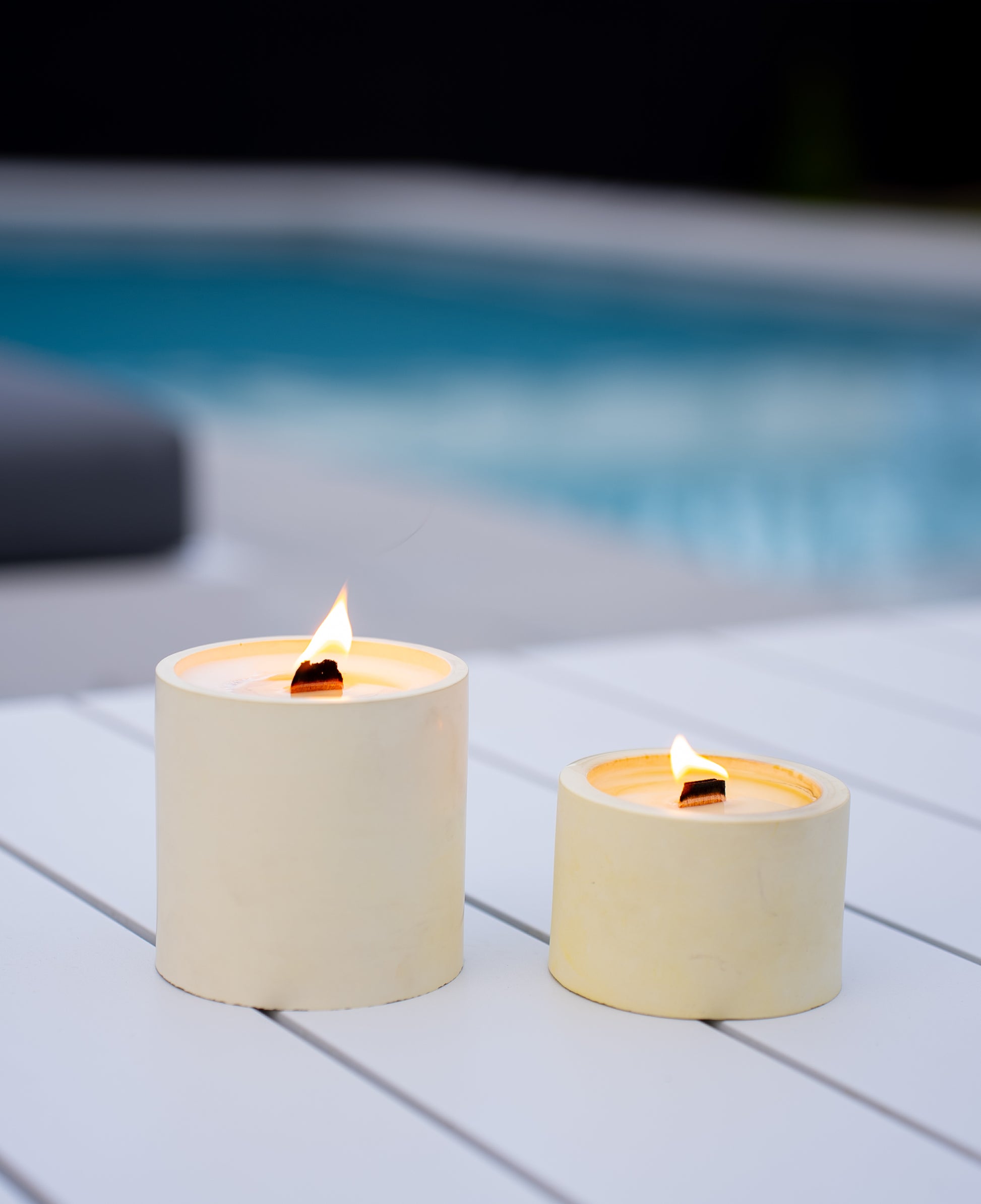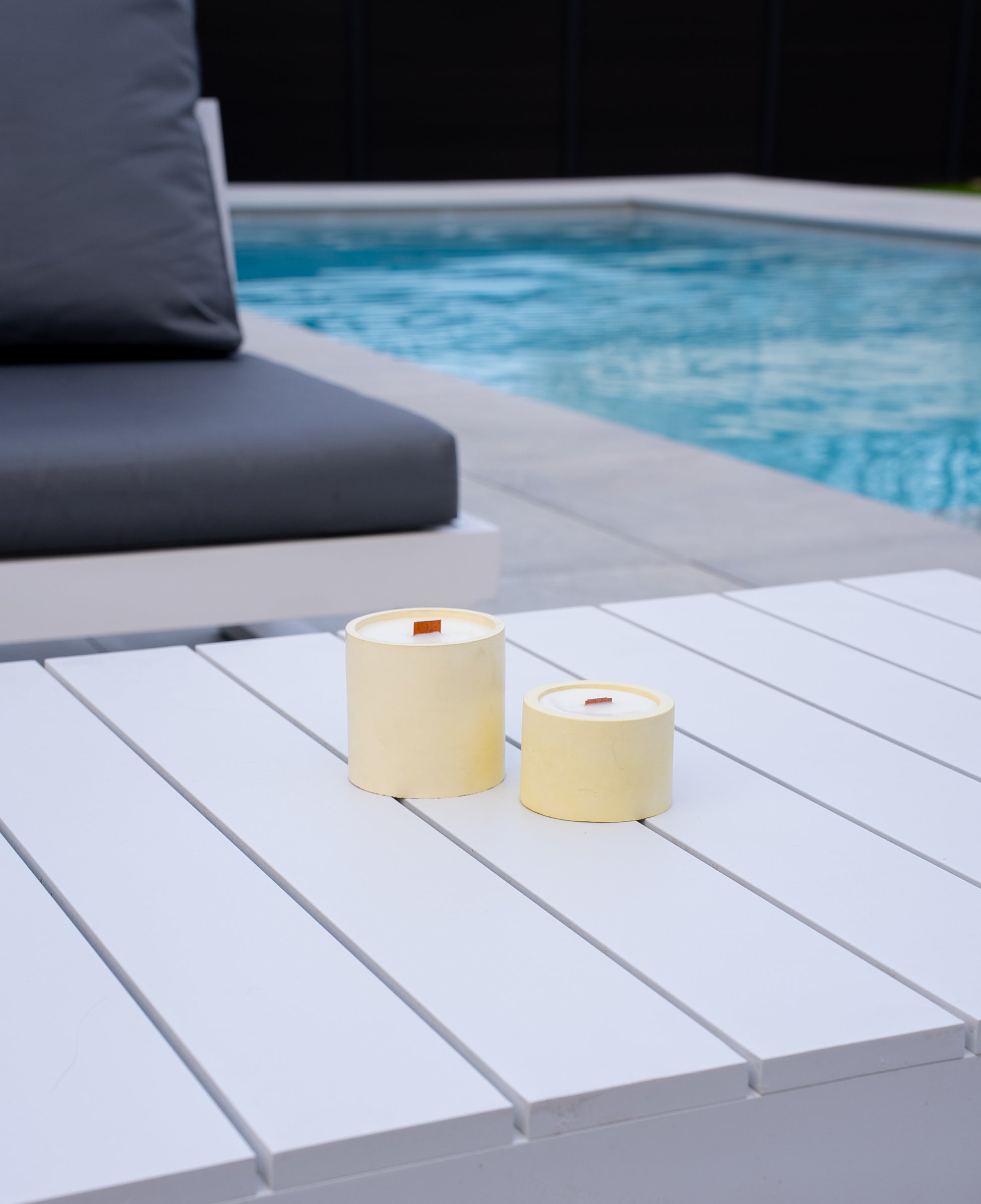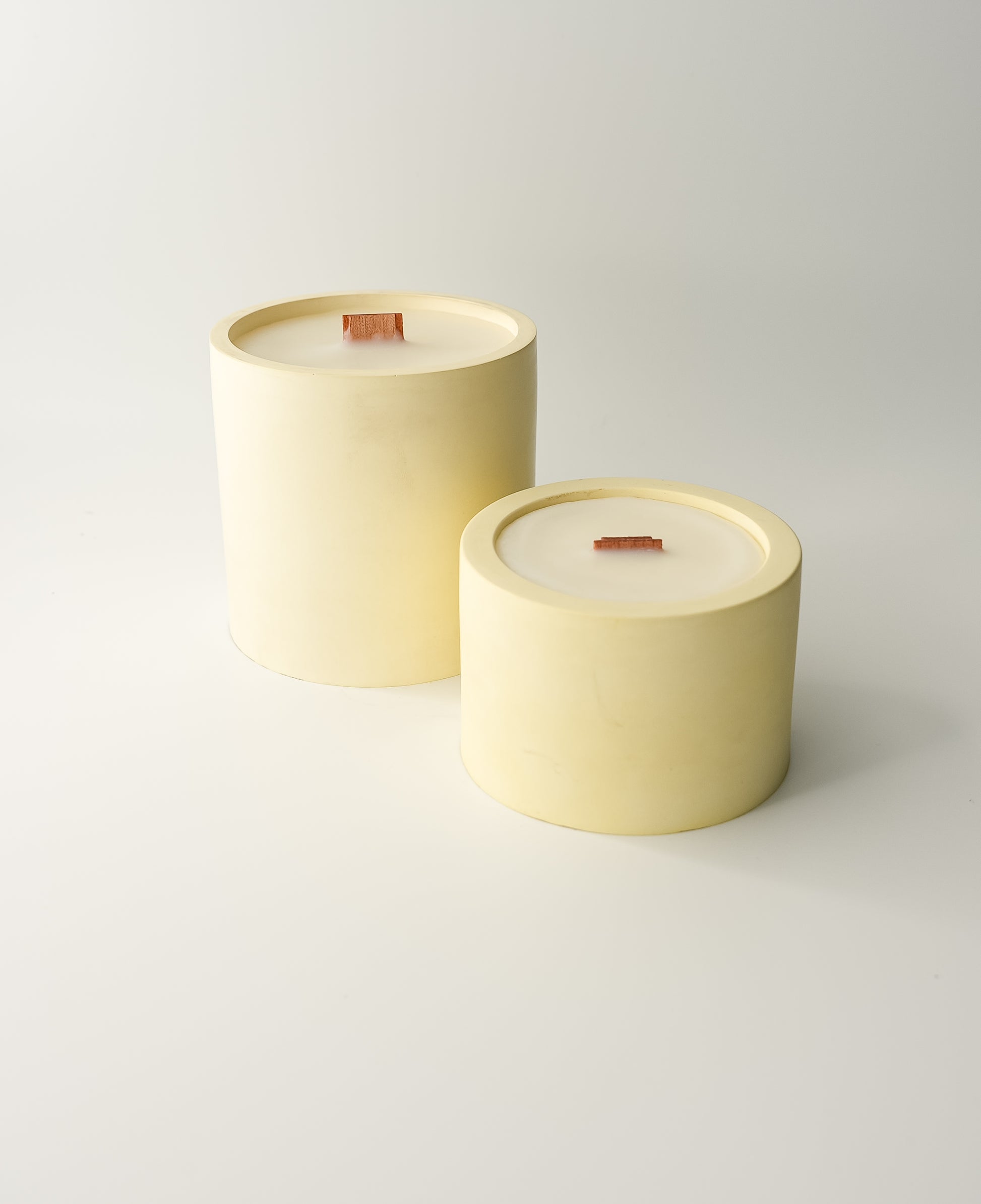 Coulée à la main dans un pot jaune en jesmonite fait main, chaque bougie est une création unique, apportant une touche lumineuse et chaleureuse à votre décoration.